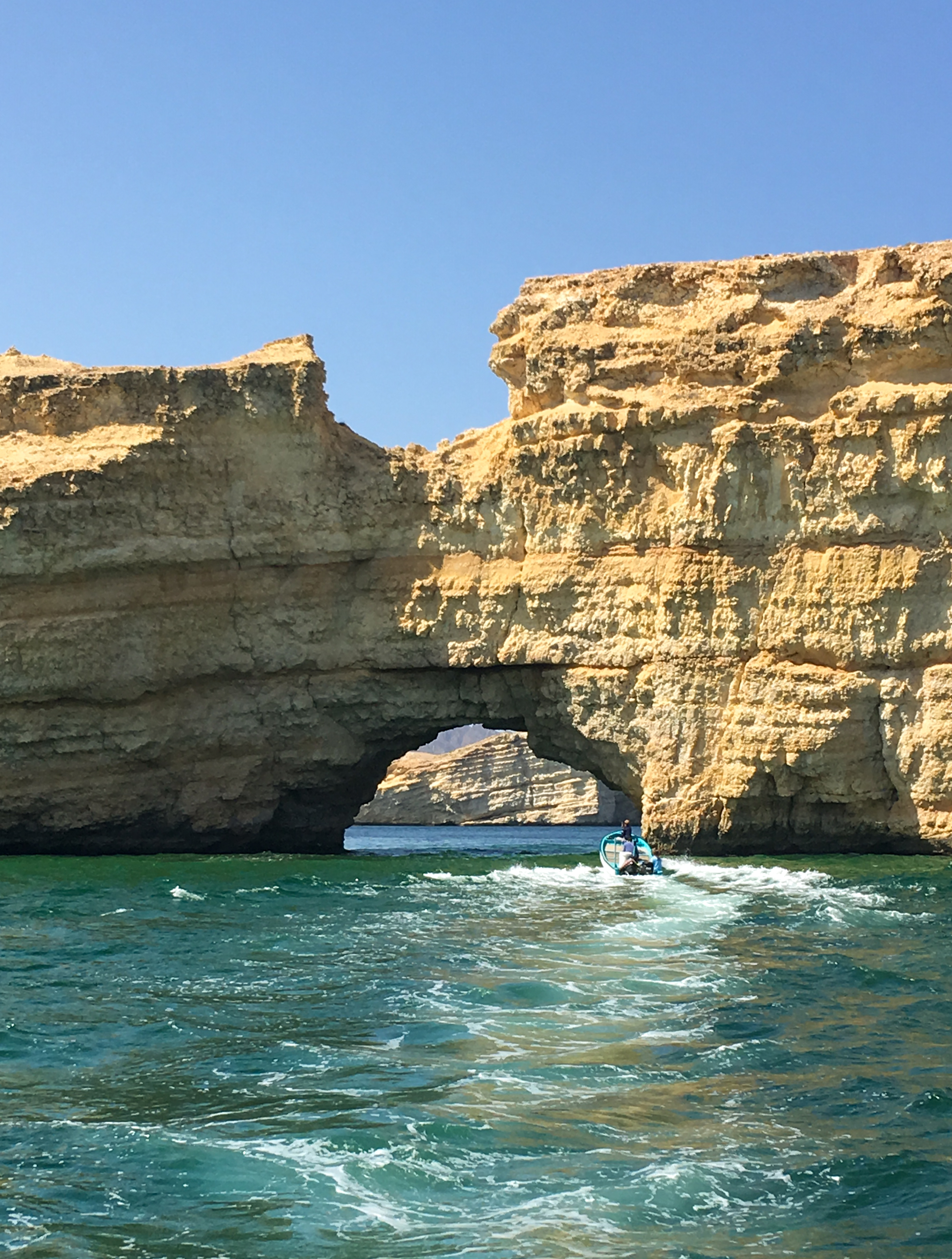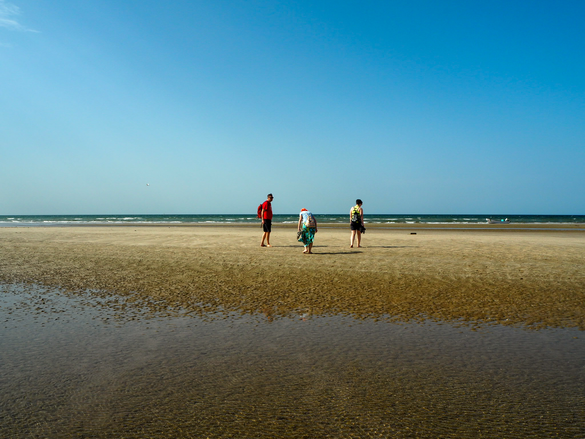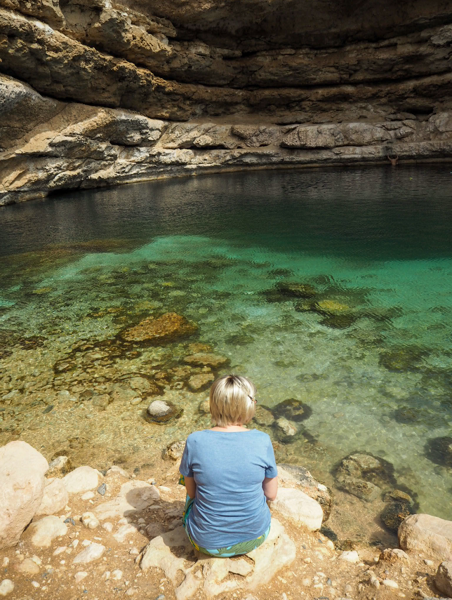 3. den: vyrazit brzy – cesta na jih, po cestě: Dayqah Dam (přehrada, výhledy, zabere cca 30 min), Bimmah Sinkhole (Ďáblova díra, parkuje se u ní, zabere cca 20 min), Wadi Shab – 3–4 km trek, pak 3 jezírka (u prvního nechat věci – nekrade se; mezi nimi kamínky, musí se projít pěšky, proto raději plavat v sandálích nebo botách do vody, poslední jezírko je v jeskyni s vodopádem), zabere cca 3 h i s koupáním, 1 OMR/os. za lodičku = převozník na začátku a konci treku, pláž Tiwi, Súr (maják, možnost navštívit muzeum výroby typických starobylých dřevěných lodí – tam jsme nakonec nešli)
